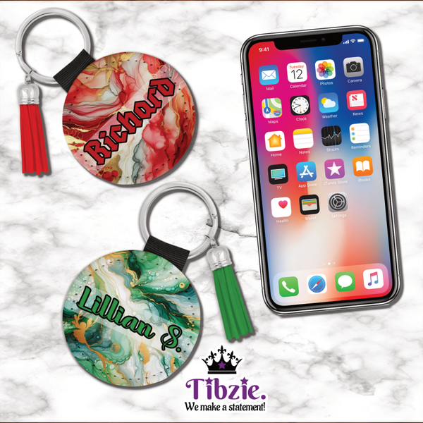 Add a splash of color and personality to your everyday carry with this handmade key ring. Customize it with a name in your choice of 12 unique font styles and one of 10 vibrant alcohol ink prints. Designed for durability and style, this double-sided key ring makes a meaningful gift or a statement piece just for you.