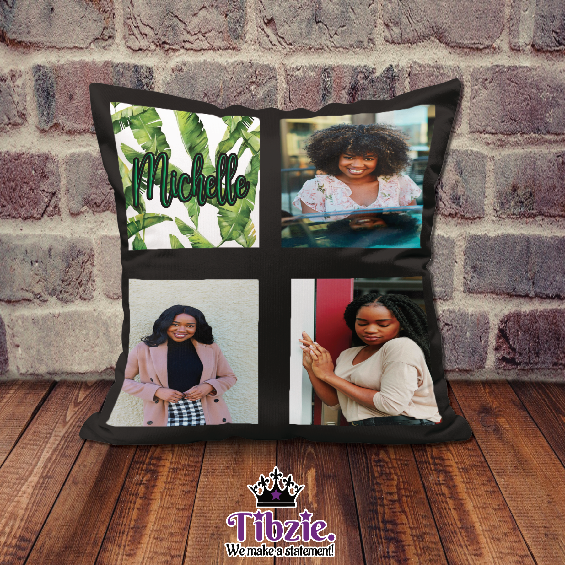 This tropical print pillow is a great option add to your home décor. Spruce up the home or office with a lively, personalized pillow. This pillow comes with 4 panels (3 photos, 1 name).