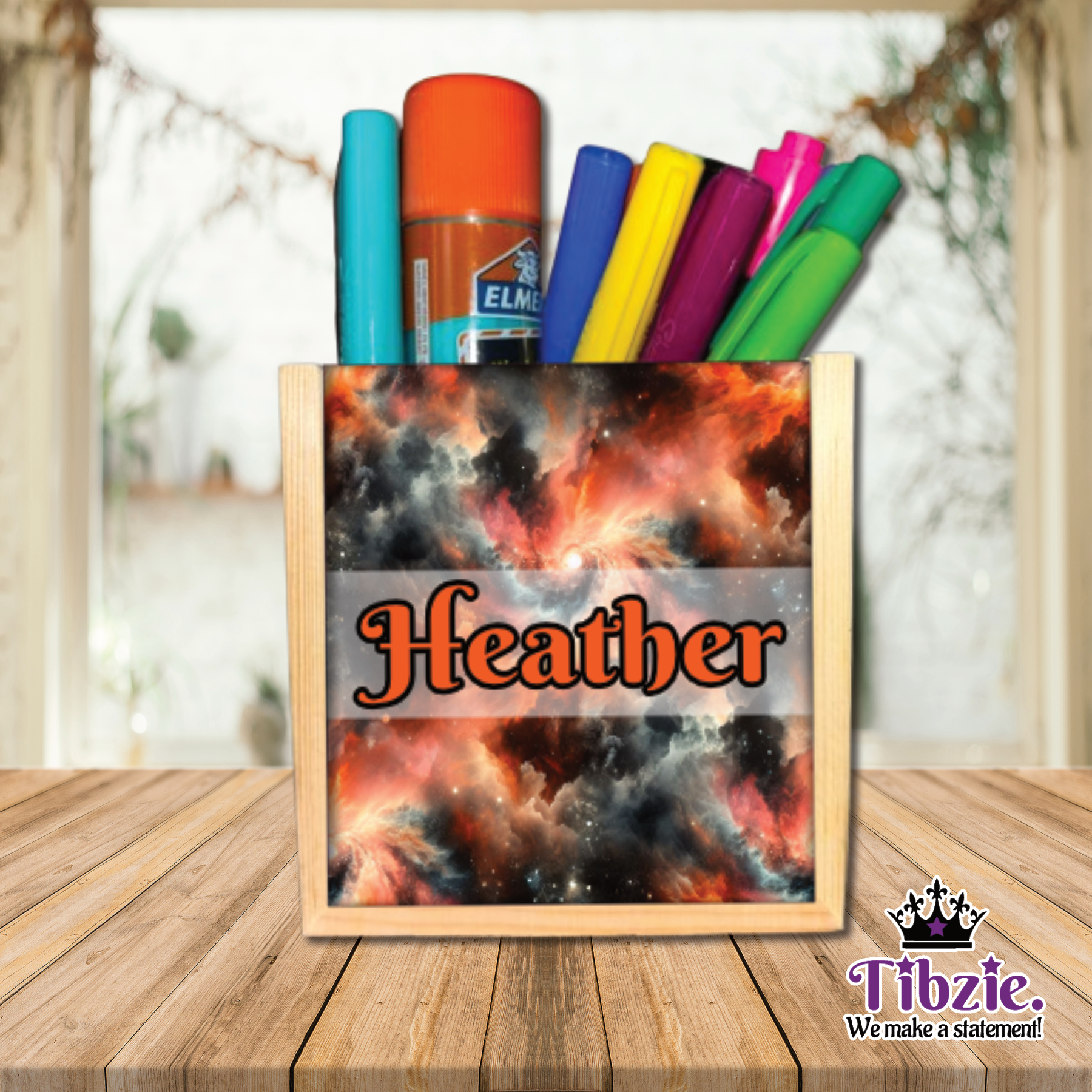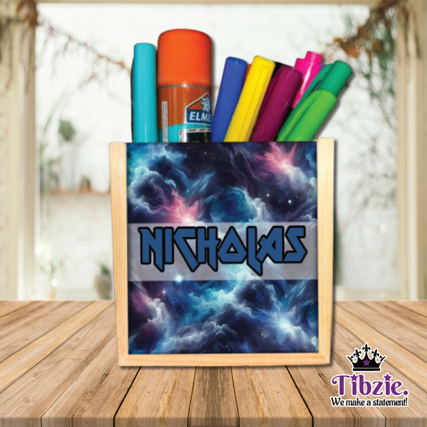 This galaxy print pencil holder makes a perfect gift! Spruce up the home, office, or classroom with this pencil holder. You can choose whether to personalize it. If you choose not to personalize the pencil holder, then only the galaxy print will be on it.