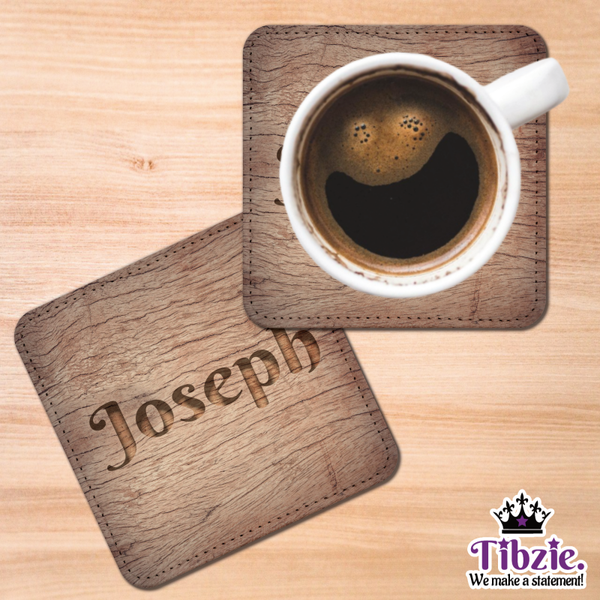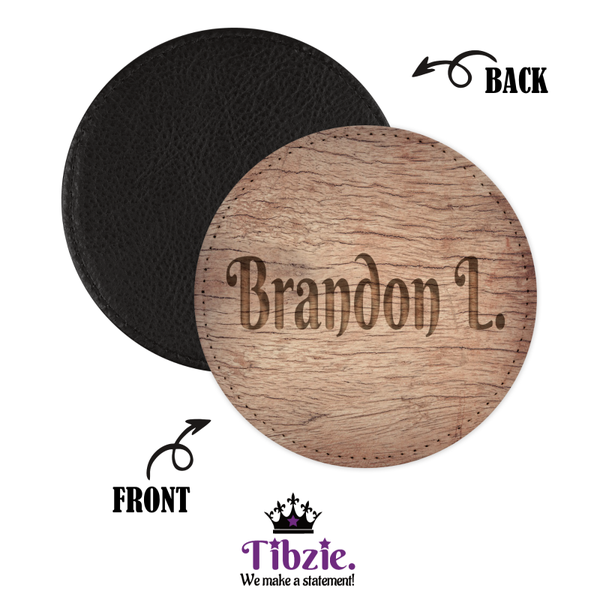 Personalized Carved Wood-Look PU Leather Coaster Set